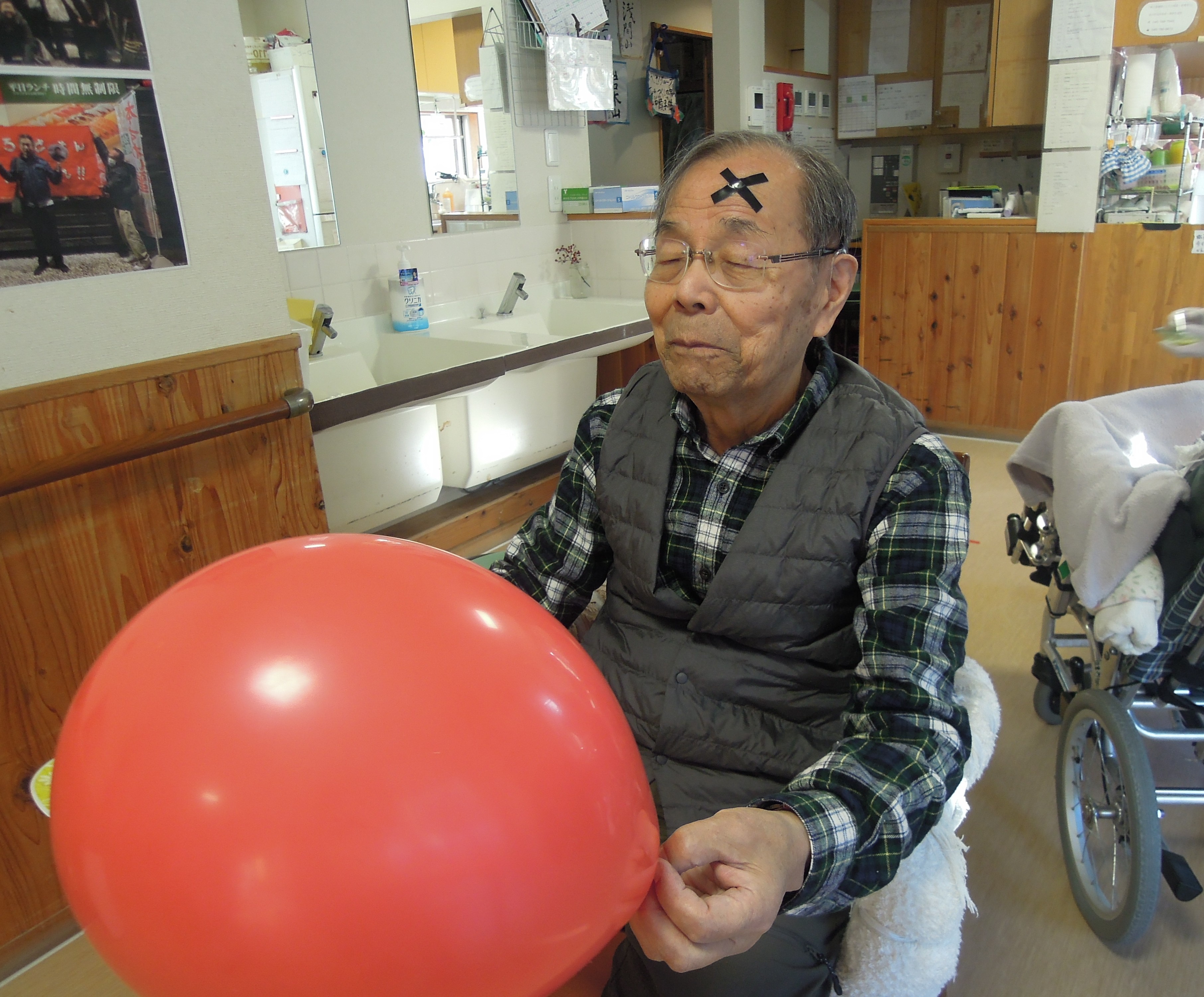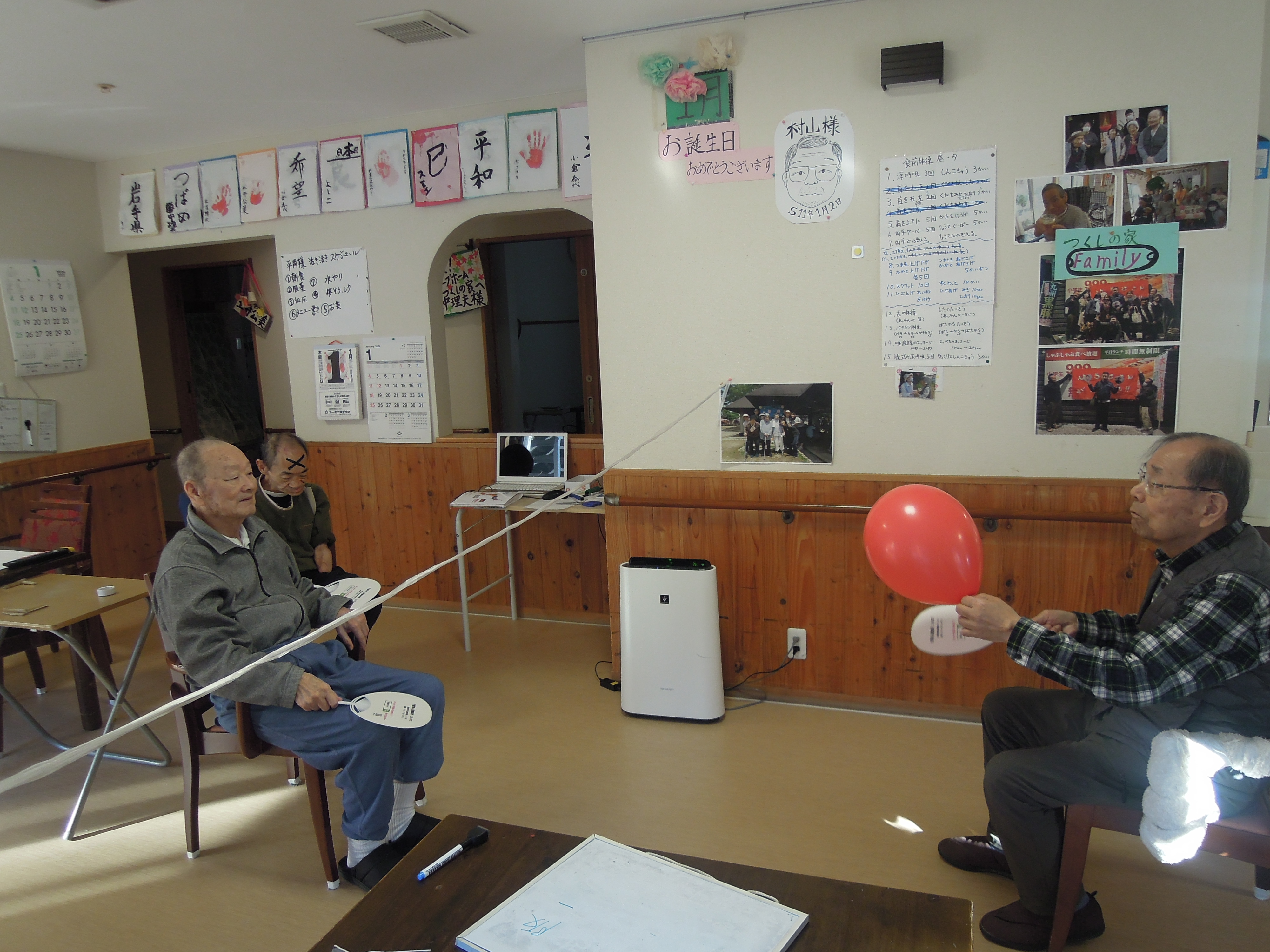 ②お正月遊び…羽子板のかわりに、うちわで風船バレーをしました。負けたら、墨ではなく黒のテープで✖マークをつけ、盛り上がりました。