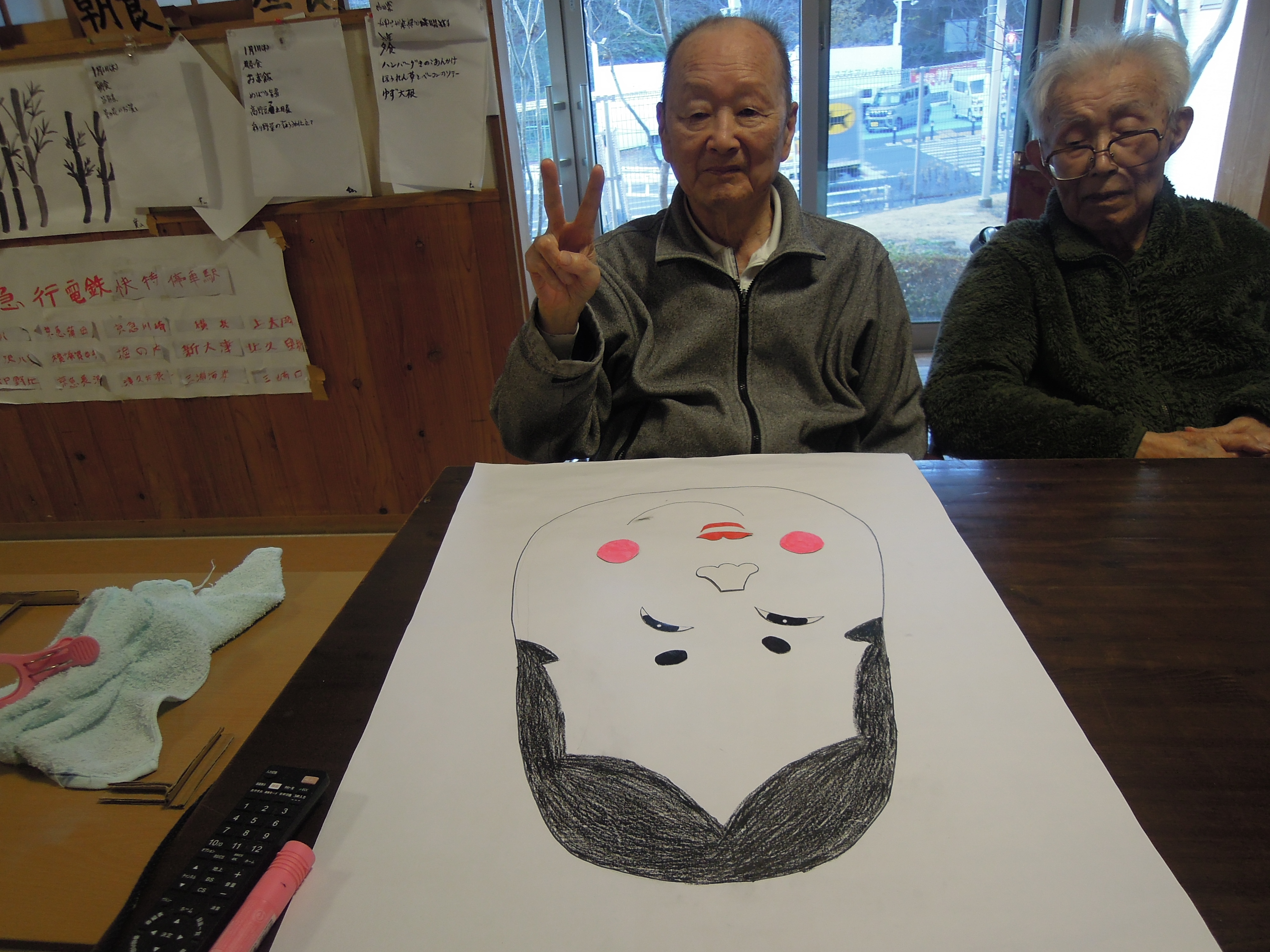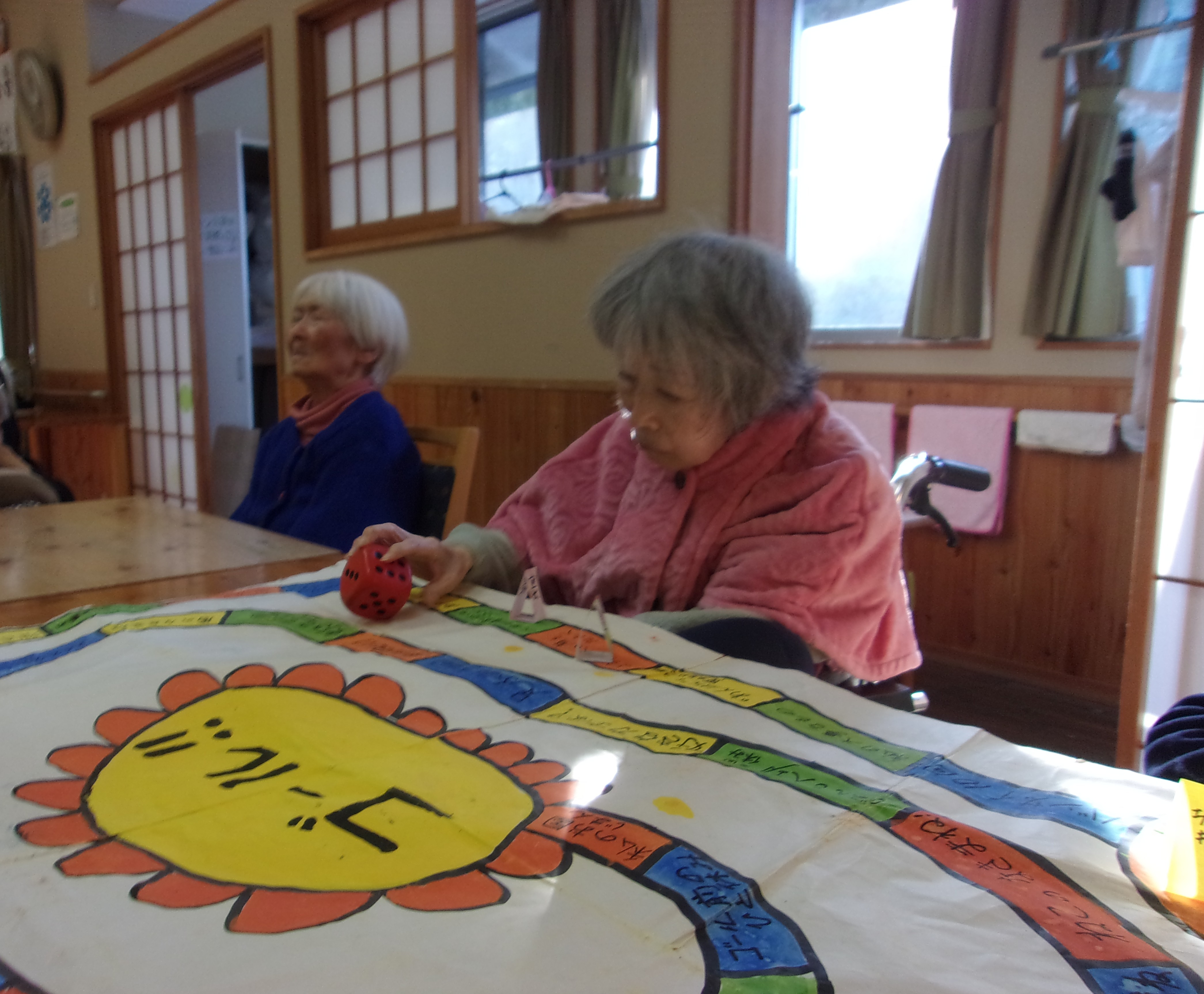 福笑いもしました。「右~左~上~下~」といろいろ言われ、いざ目隠しとっての大笑い!手作り双六は開所時に作成したもので、13年ものです‼